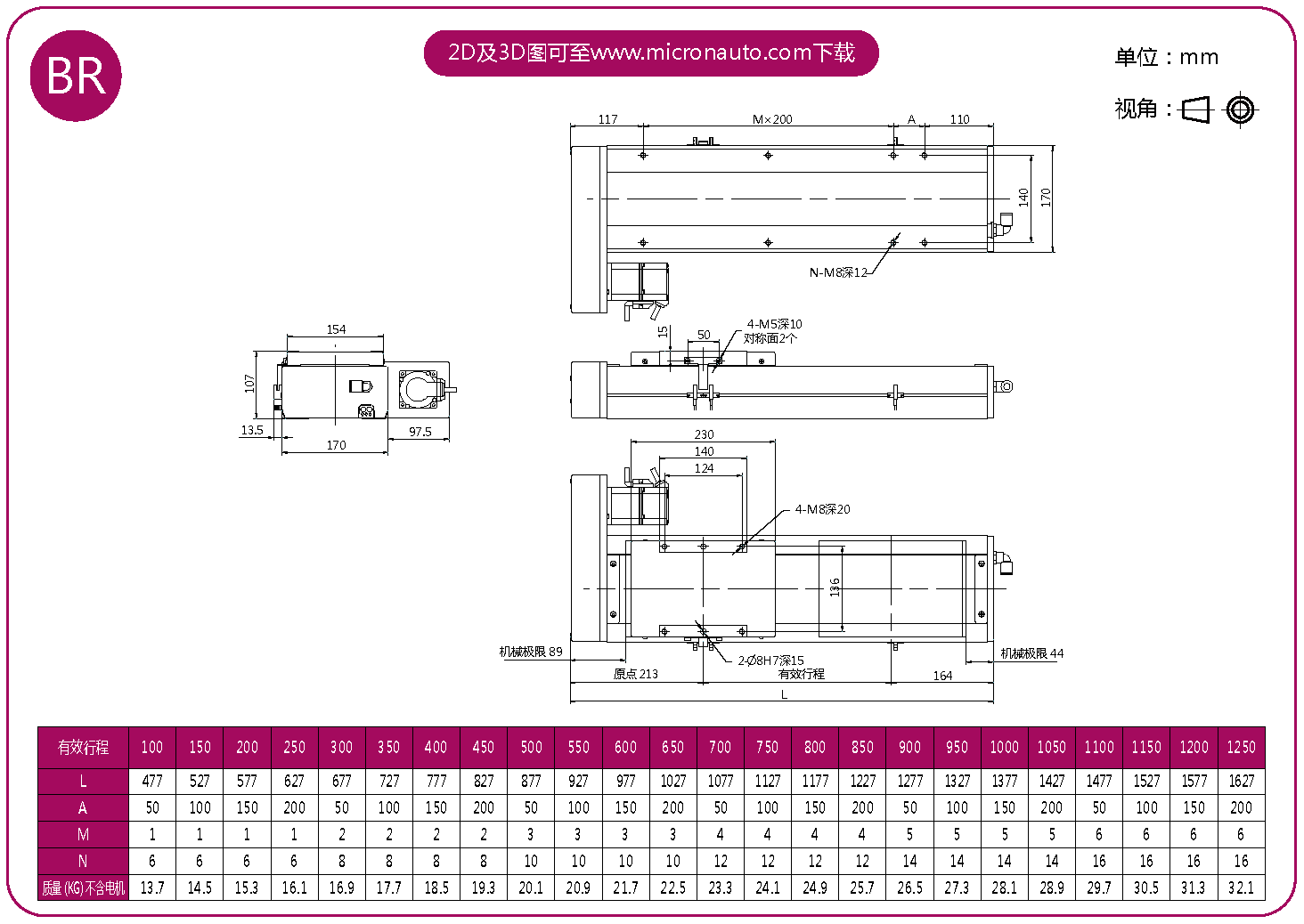 標準有效行程: 100~1250mm(間隔50mm)