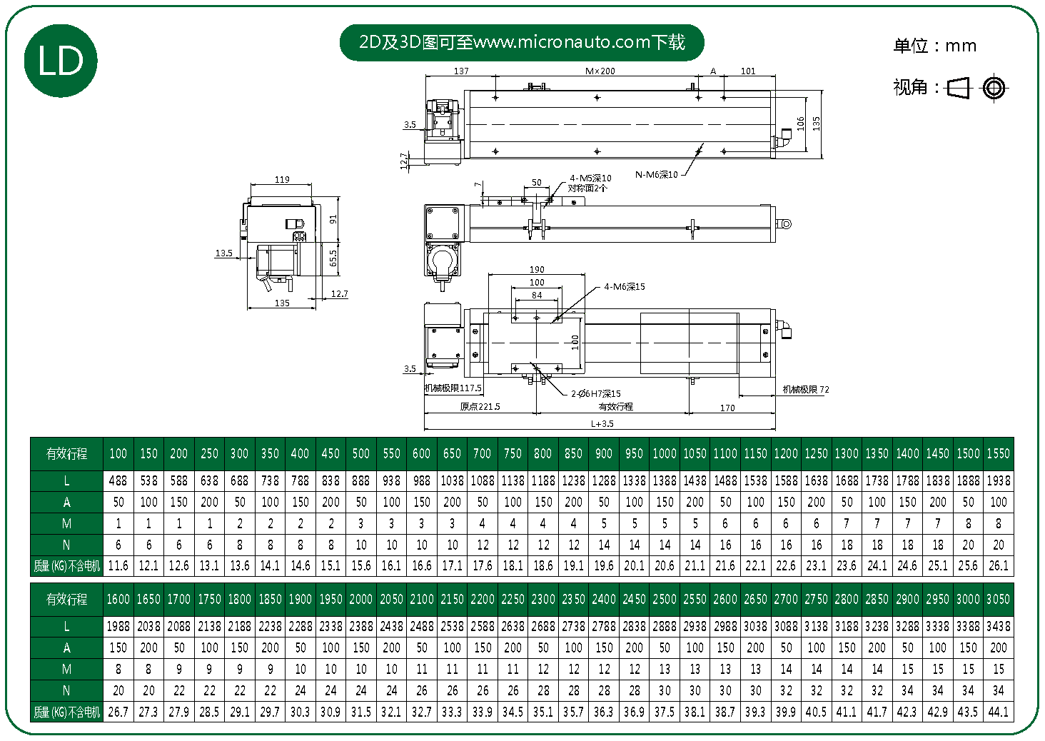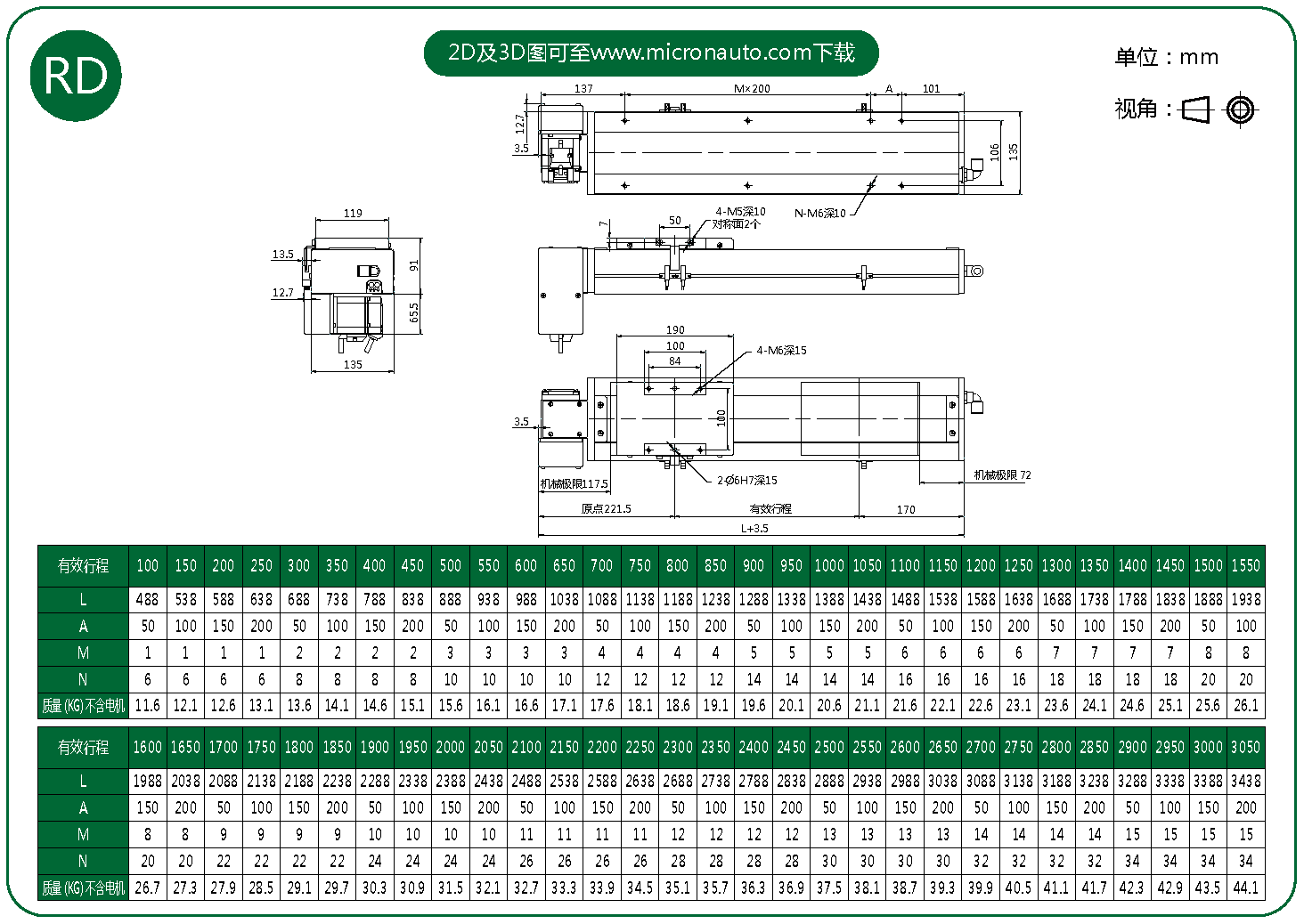 標準有效行程: 100~3050mm(間隔50mm)