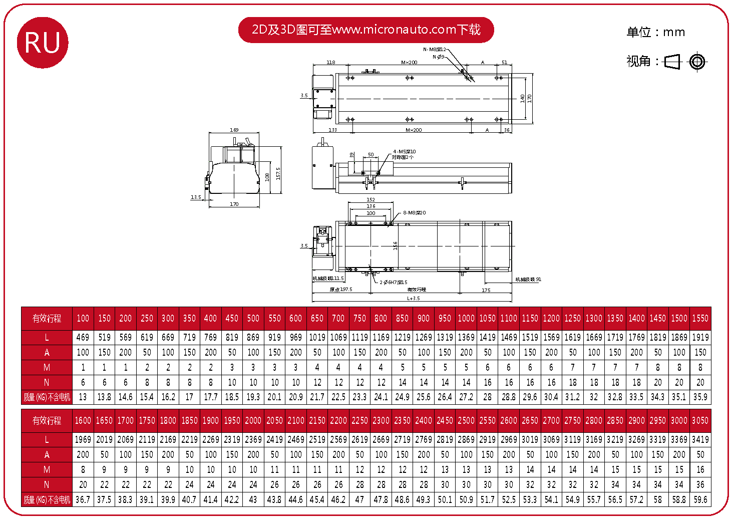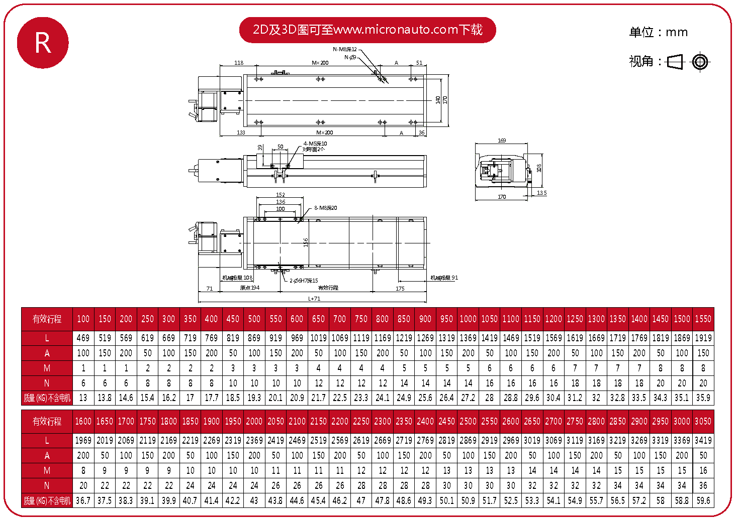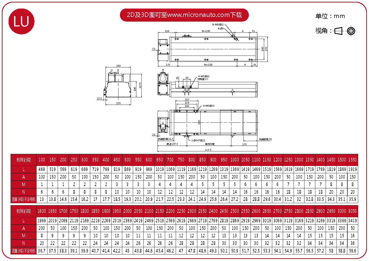 標準有效行程: 100~4050mm(間隔50mm)